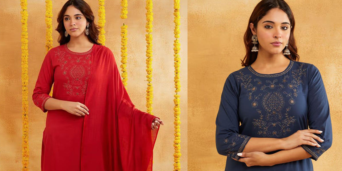 Discover Dharya’s festive edit — where soft pastels meet intricate embroidery on cotton, silk, and linen.
