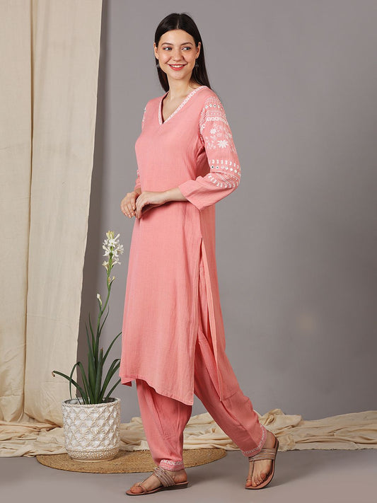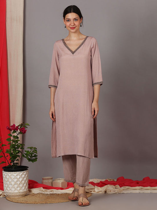 DUSTY PINK V-NECK EMBELLISHED KURTA WITH PANTS