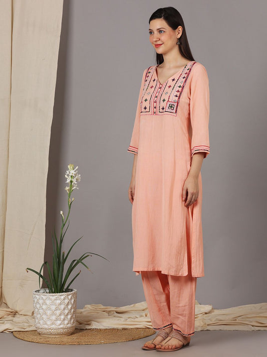 PEACH EMBROIDERED VISCOSE LINEN KURTA WITH SALWAR