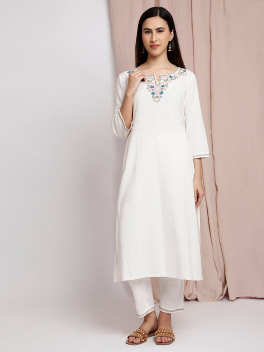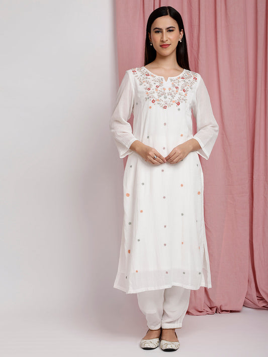 WHITE EMBROIDERED COTTON LINEN KURTA WITH PANTS