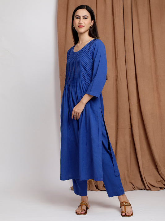 ROYAL BLUE COTTON LINEN PLEATED KURTA WITH PANTS