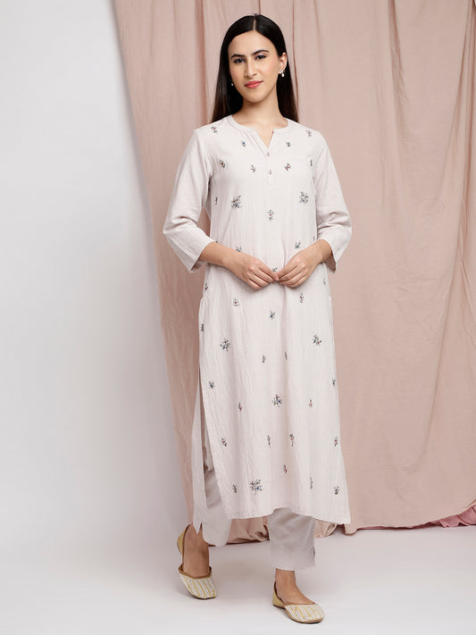 GREY COTTON LINEN EMBROIDERED KURTA WITH PANTS