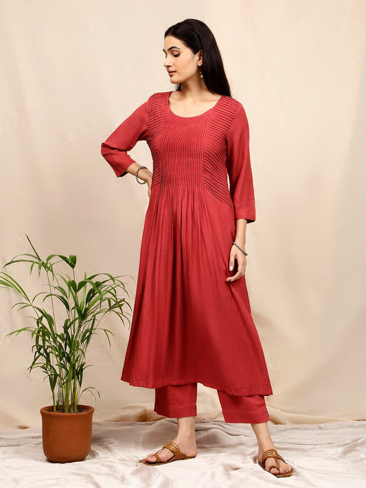RUST COTTON LINEN PLEATED KURTA WITH PANTS