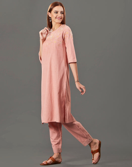 LIGHT PINK EMBROIDERED COTTON LINEN KURTA WITH PANTS