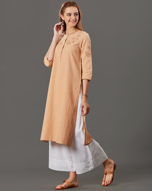 BEIGE CUTWORK EMBROIDERED COTTON LINEN KURTA WITH PALAZZO