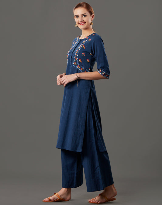 BLUE EMBROIDERED COTTON LINEN KURTA WITH PALAZZO