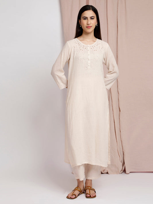 CREAM CUTWORK EMBROIDERED COTTON KURTA WITH PANTS