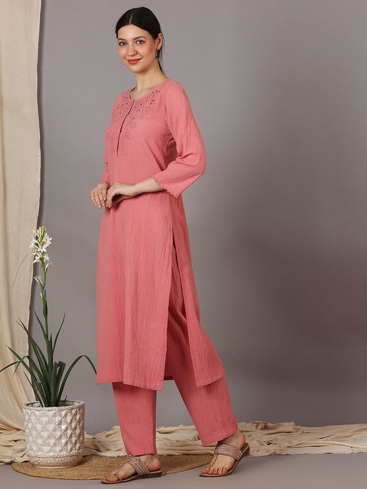 ROSE PINK CUTWORK EMBROIDERED COTTON KURTA WITH PANTS