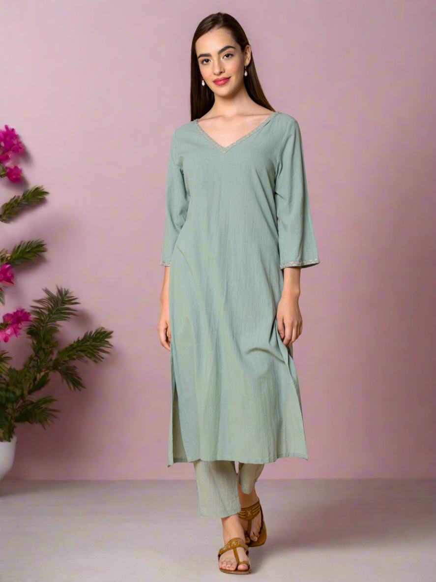 BROWN CUTWORK EMBROIDERED COTTON KURTA WITH PANTS AND DUPATTA