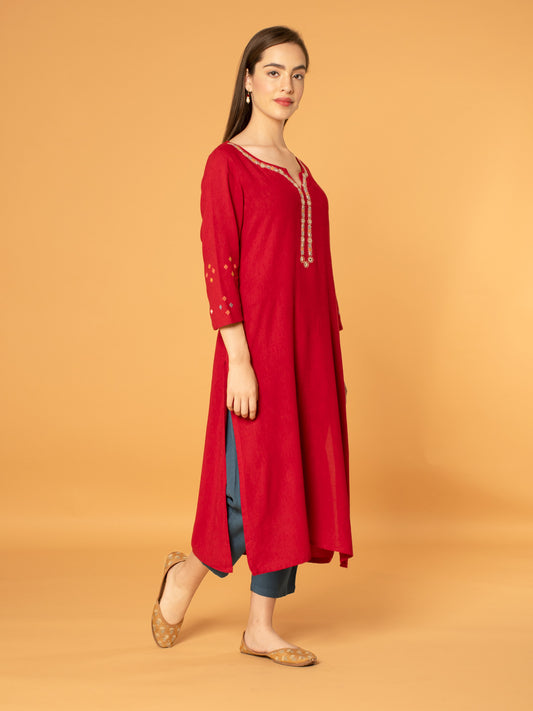 RED MIRROR EMBROIDERED LINEN VISCOSE KURTA WITH PANTS