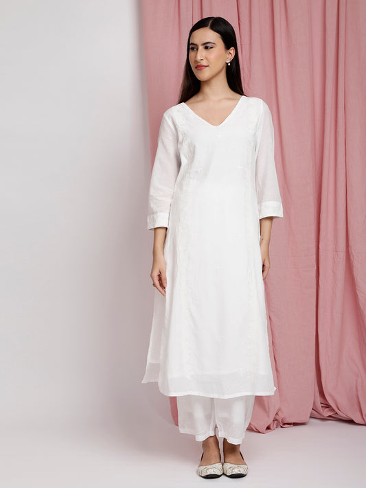 IVORY APPLIQUE EMBROIDERED COTTON SILK KURTA WITH PANTS