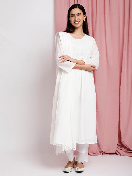 WHITE COTTON SILK PLEATED KURTA WITH PANTS