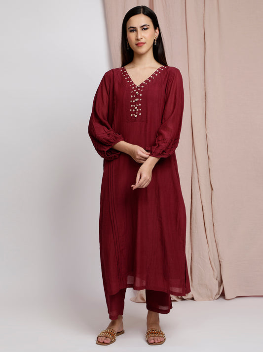 MAROON EMBROIDERED COTTON SILK KURTA WITH FLARED PALAZZO