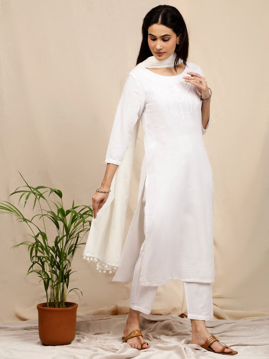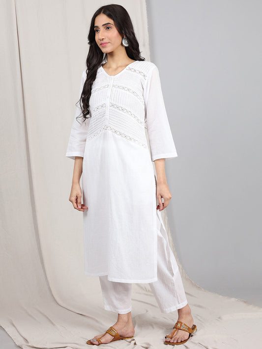 WHITE EMBROIDERED V-NECKLINE STRAIGHT FIT KURTI, WITH PANTS