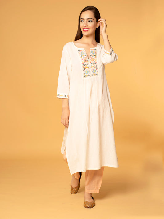 WHITE EMBROIDERED LINEN VISCOSE KURTA