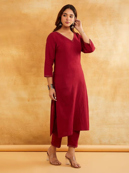 Maroon Zari Embroidered Cotton Kurta with Pants