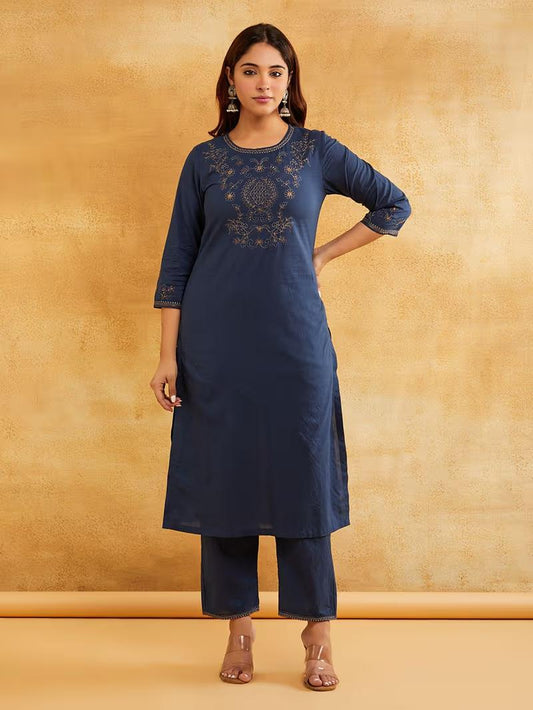 Blue Embroidered Cotton Linen Kurta with Pants