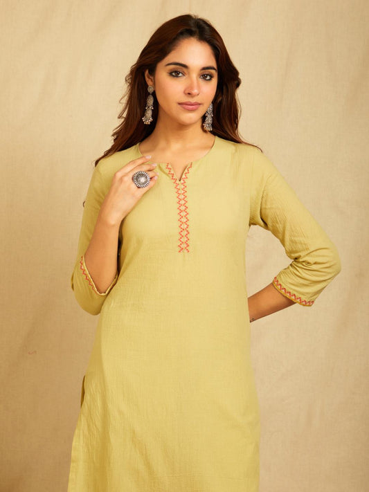 Khaki Green Cotton Embroidered Kurta with Pants & Dupatta