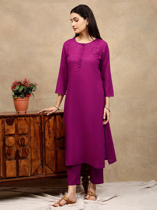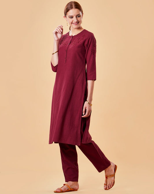 MAROON EMBROIDERED COTTON LINEN KURTA