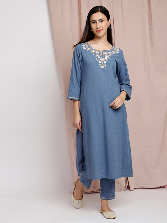 BLUE COTTON APPLIQUE EMBROIDERED KURTA