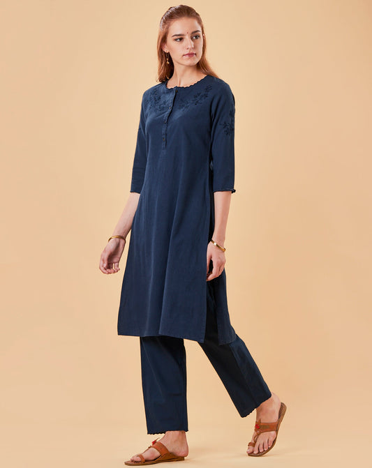 NAVY BLUE CUTWORK EMBROIDERED COTTON LINEN KURTA