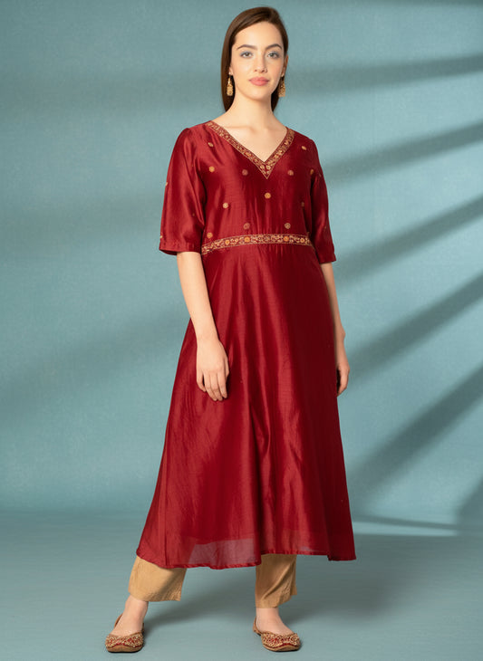 MAROON EMBROIDERED CHANDERI KURTA WITH BEIGE VISCOSE PANTS AND DUPATTA