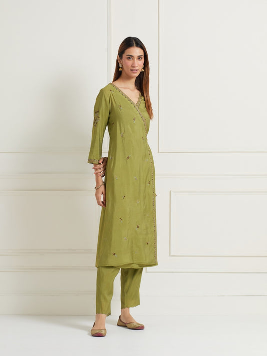 GREEN ANGRAKHA EMBELLISHED CHANDERI KURTI