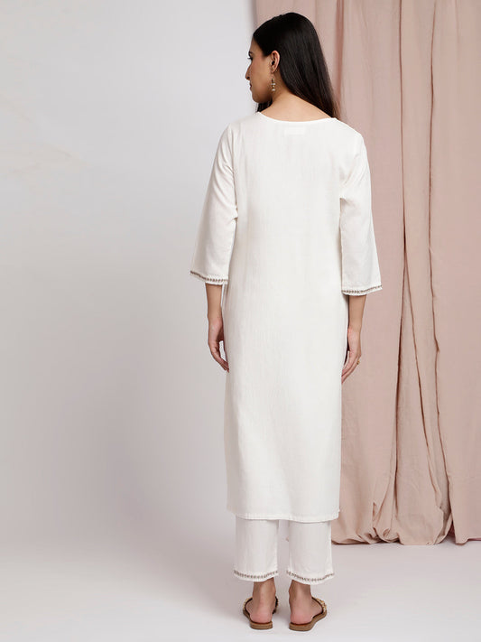 OFF-WHITE COTTON LINEN APPLIQUE EMBROIDERED KURTA