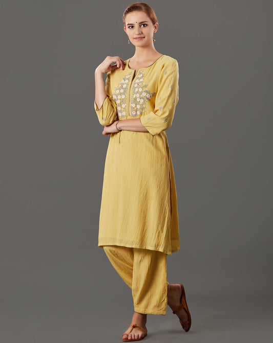 YELLOW EMBROIDERED COTTON SILK KURTA