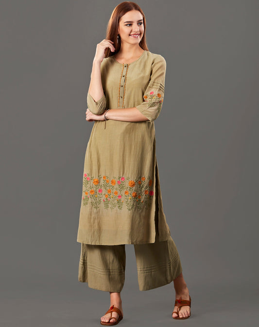OLIVE GREEN EMBROIDERED COTTON SILK KURTA