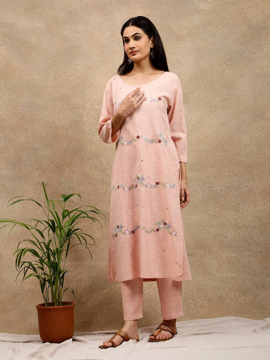 PINK COTTON SLUB FLORAL EMBROIDERED KURTA