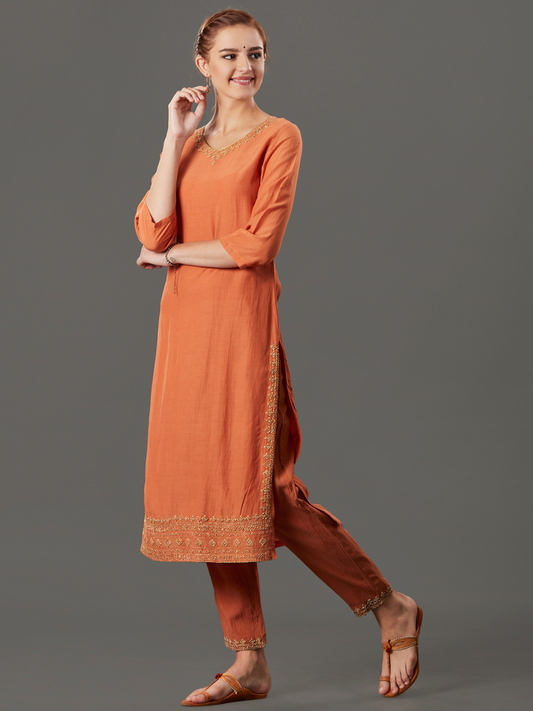 ORANGE EMBROIDERED COTTON SILK KURTA