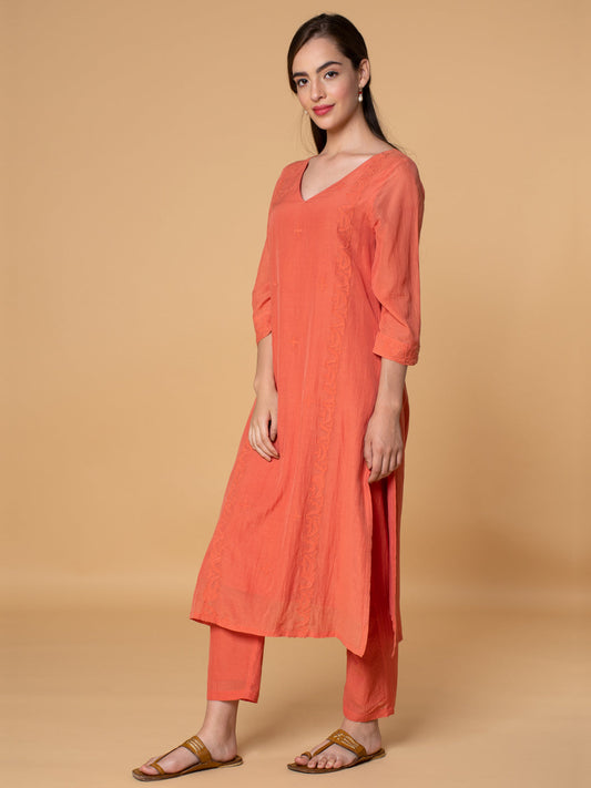 CORAL APPLIQUE EMBROIDERED COTTON SILK KURTA