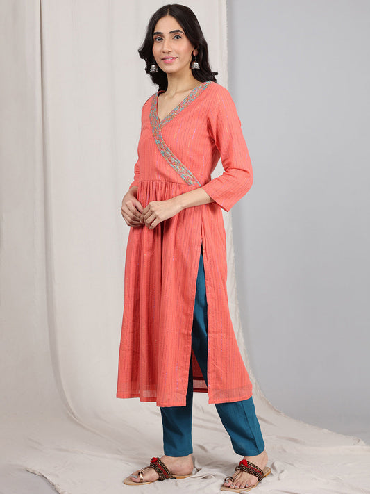 CORAL EMBROIDERED COTTON LUREX GATHERED KURTA