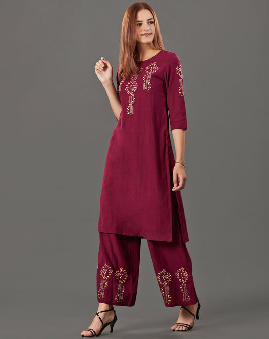 MAROON EMBROIDERED COTTON SILK KURTA WITH FLARED PALAZZO