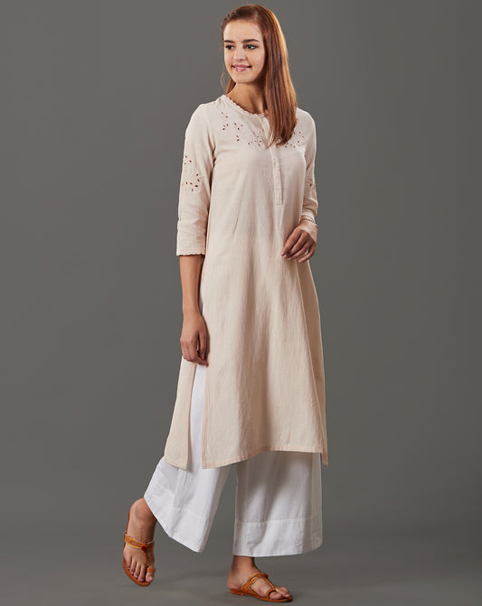 BEIGE CUTWORK EMBROIDERED COTTON LINEN KURTA WITH PALAZZO