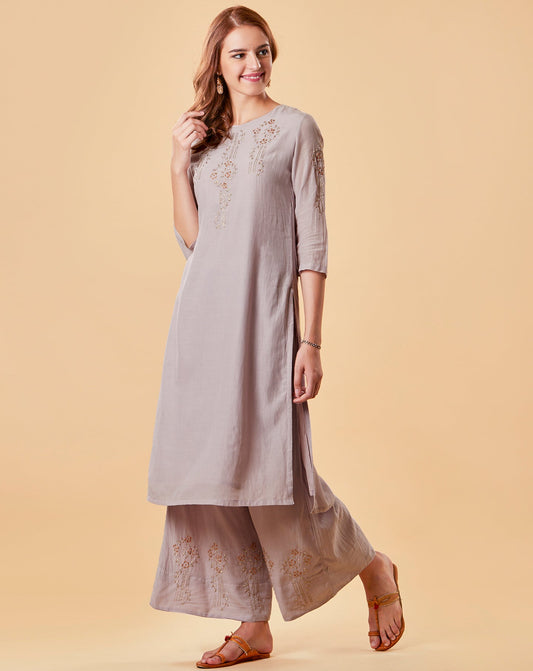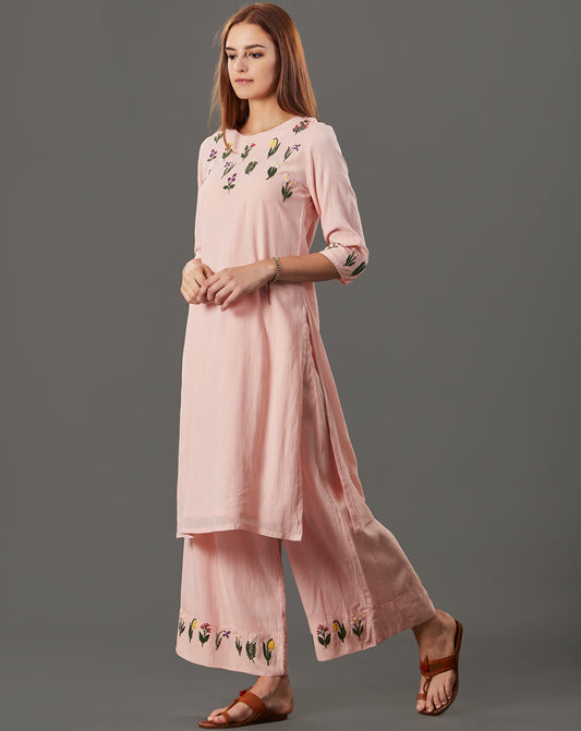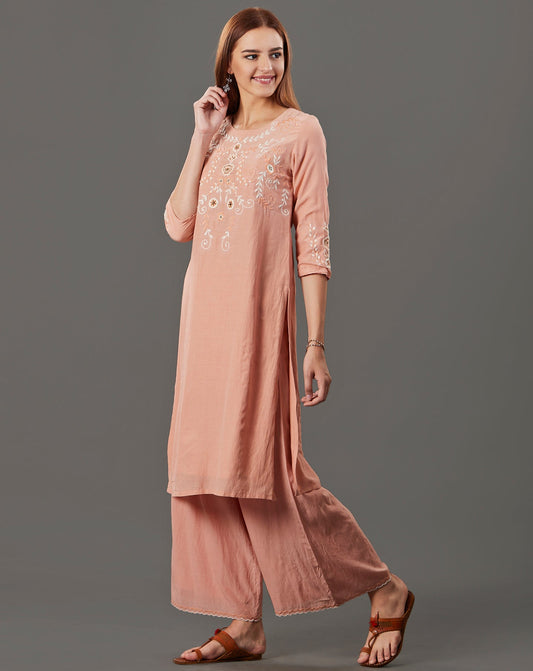 PEACH EMBROIDERED COTTON SILK KURTA WITH PALAZZO
