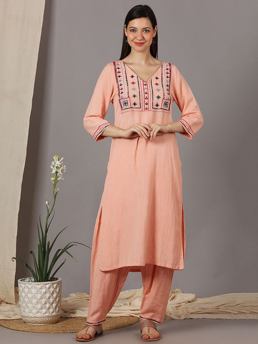 DUSTY PINK V-NECK EMBELLISHED KURTA WITH PANTS