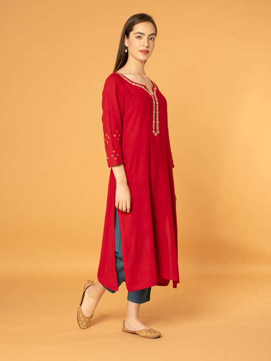 RED MIRROR EMBROIDERED LINEN VISCOSE KURTA
