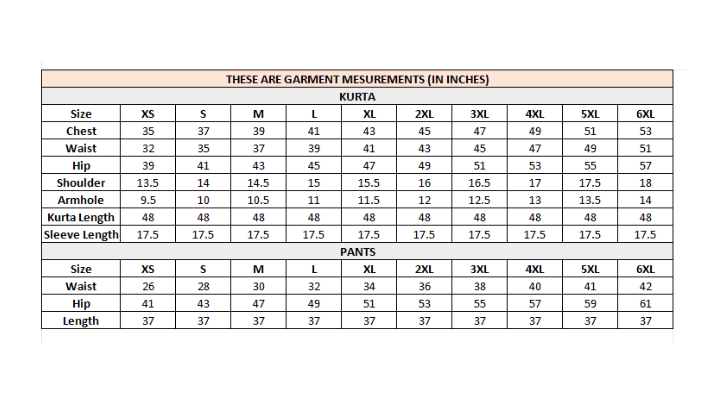 These are Garment measurement in Inches. If you need any customization of Sizes please contact us. Products can be custom made as per requirement as well.
