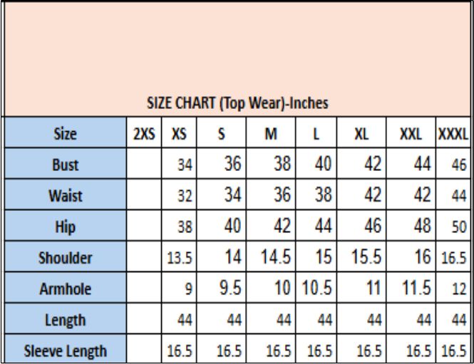 These are Garment measurement in Inches. If you need any customization of Sizes please contact us. Products can be custom made as per requirement as well.