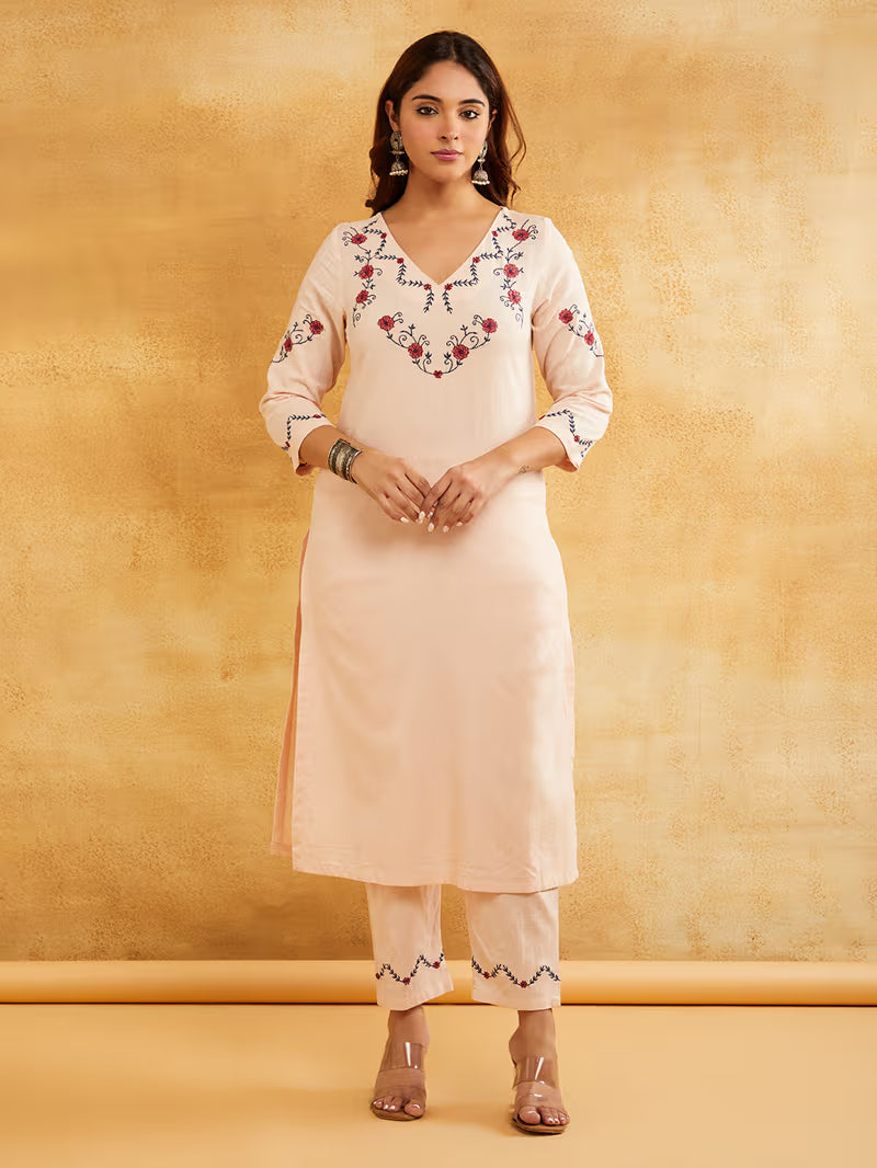 Light Pink Embroidered Cotton Linen Kurta with Pants