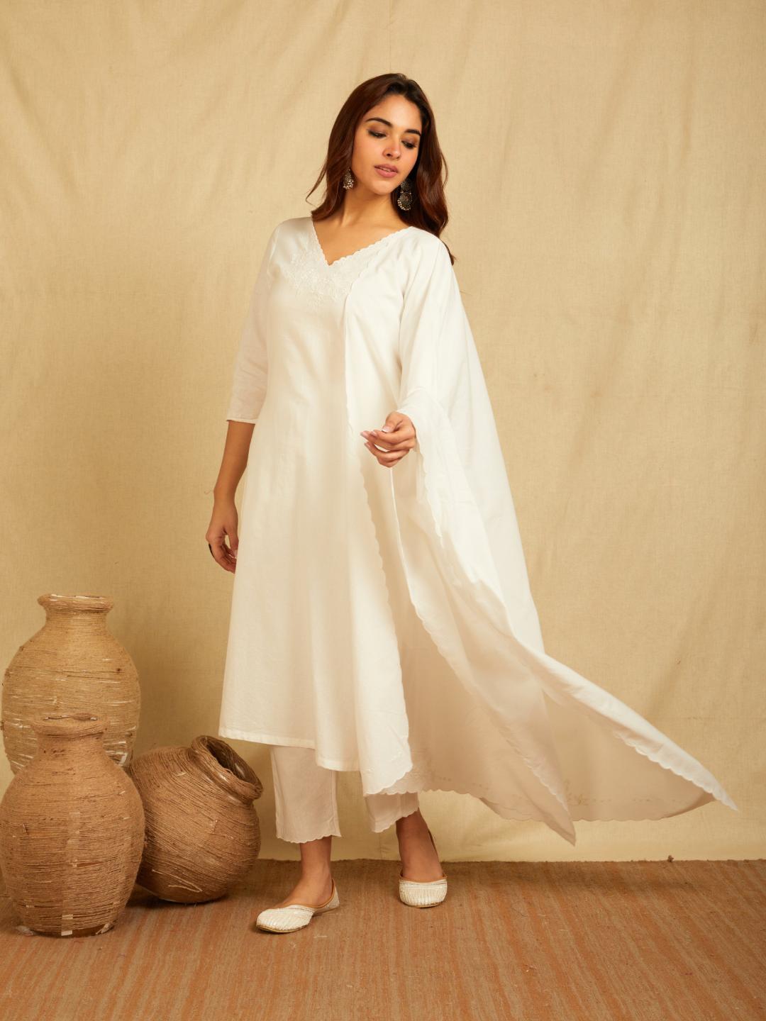 White Scallop embroidered Kurta with Pants. This set is a perfect pick for casual wear. Fabricated in premium quality cotton fabric, this White kurta features a tonal embroidery on V-neckline, and quarter sleeves with embroidery & scalloping detail. This kurta comes with matching pants with scalloping detail, elasticated waist and side pockets.